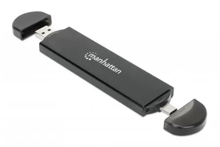 130639 Gabinete USB a SDD M.2 NVMe y SATA, Conector USB-C y USB-A integrado para una conexión de host versátil.