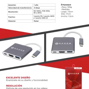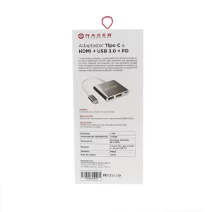 Adaptador Tipo C a HDMI + USB 3.0 + PD Naceb Technology NA-0111, Plata, USB C, HDMI + USB 3.0 + PD