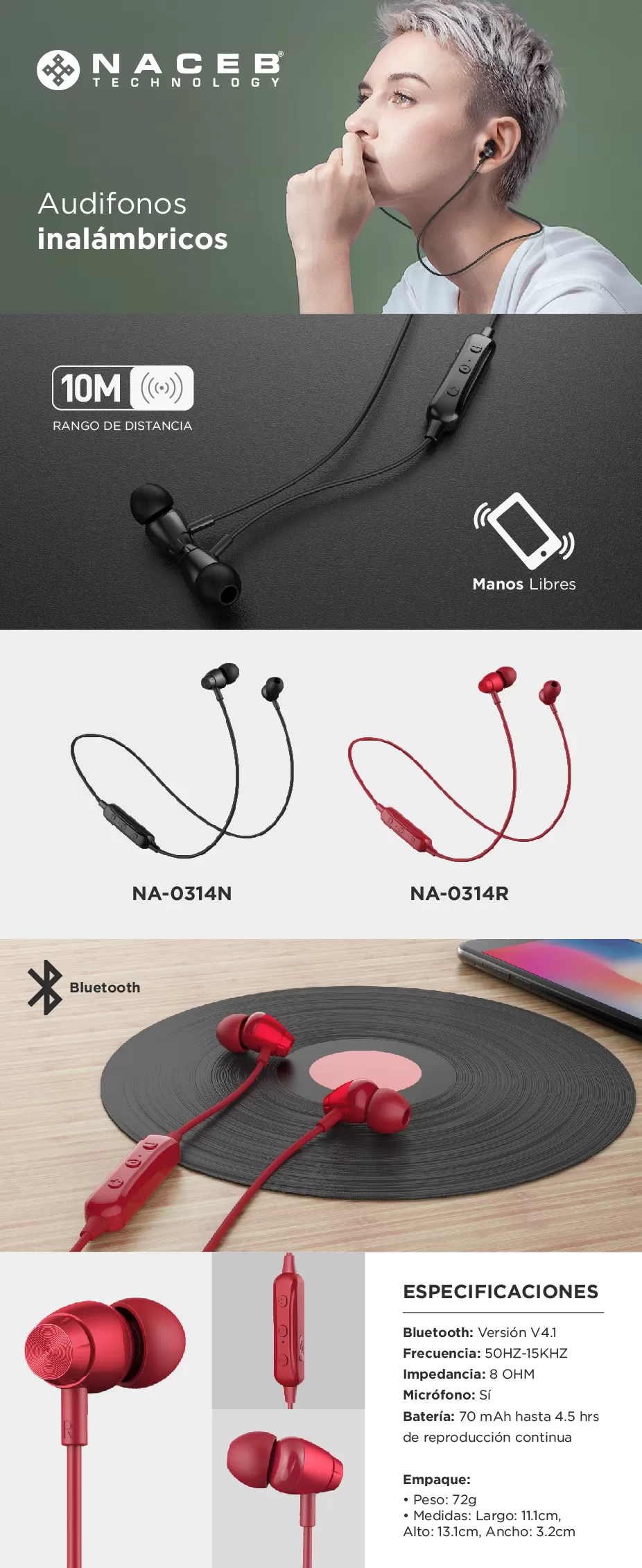 Audífono Bluetooth Naceb Technology NA-0314R, Rojo, Bluetooth, Universal