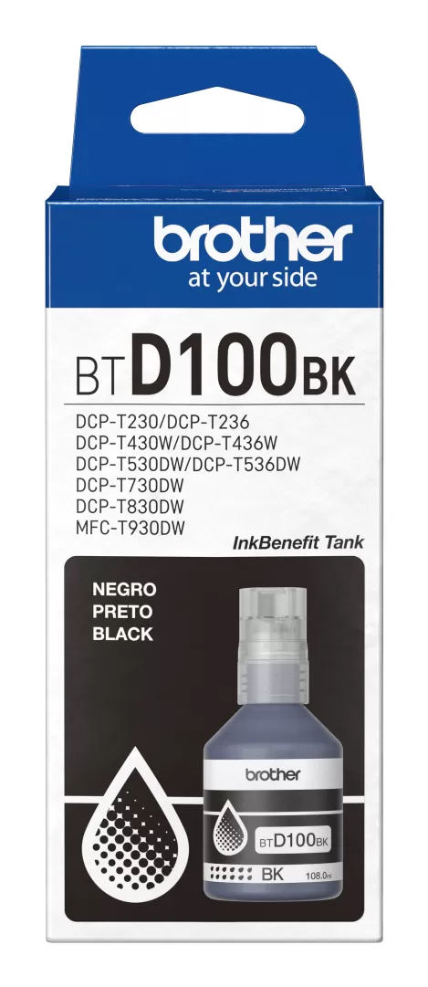 Botella de tinta Brother BTD100BK negro, rendimiento aproximado 7,500 páginas, compatible con DCPT230, DCPT530DW, DCPT730DW, MFCT930DW