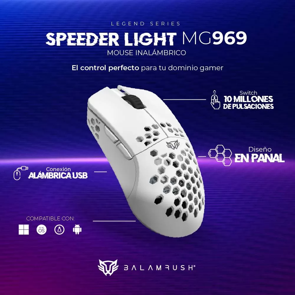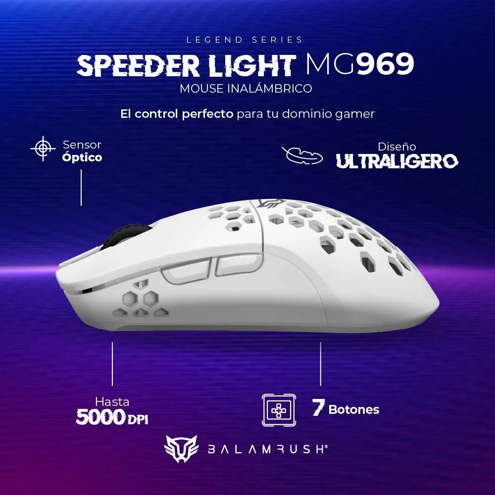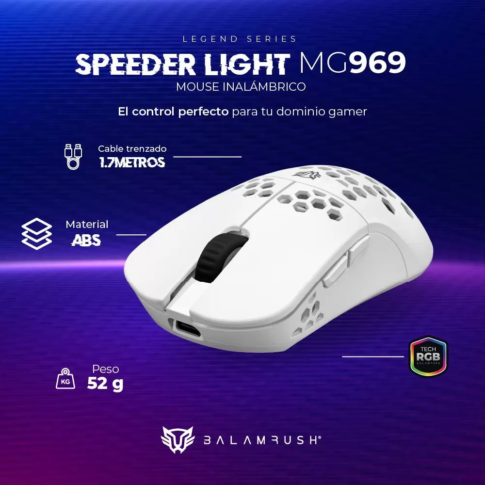 Mouse Gamer Inalámbrico Ultra ligero Speed Light MG969 Balam Rush Conexiones Bluetooth, 2.4ghz y USB, 7 Botones, Scroll tipo HUANO, DPI 800 a 5000. Ilumina