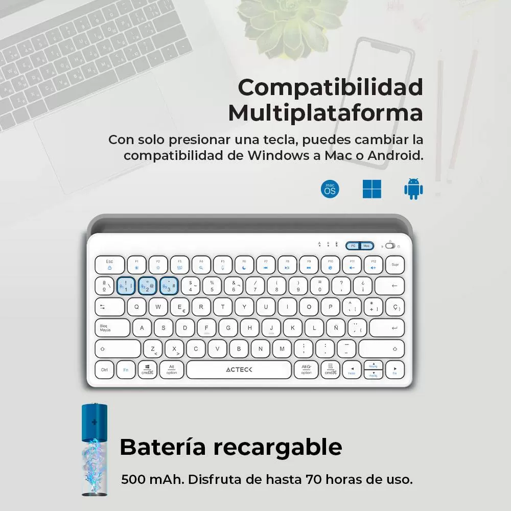 Teclado Inalámbrico Multidispositivos AC-940139 INSPIRE TREK TI737 Acteck Elite Series Bluetooth 5.1, Dongle 2.4 MHz